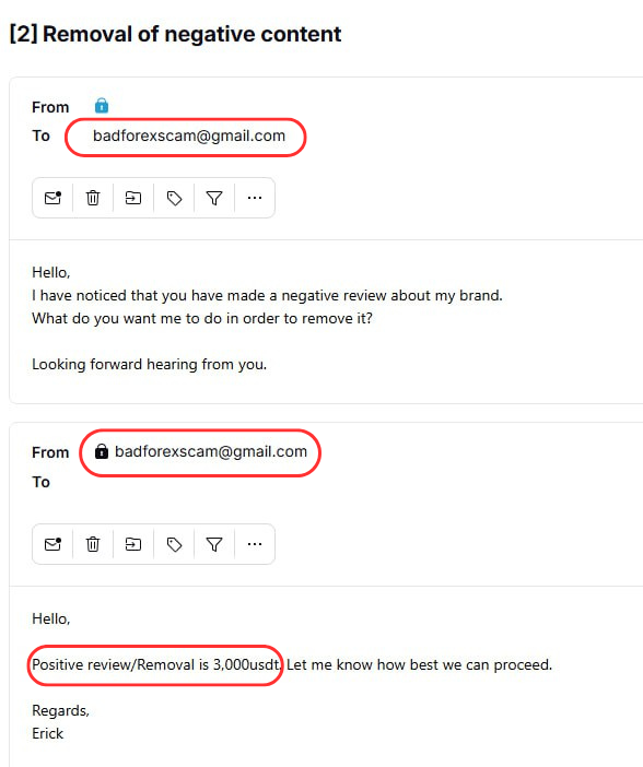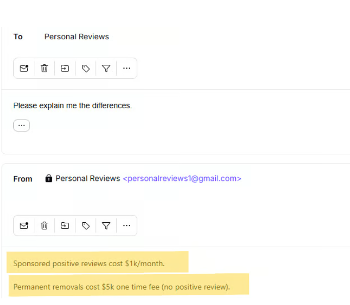 They told us that removing the review or replacing it with a fake positive one would cost $3,000 USDT.