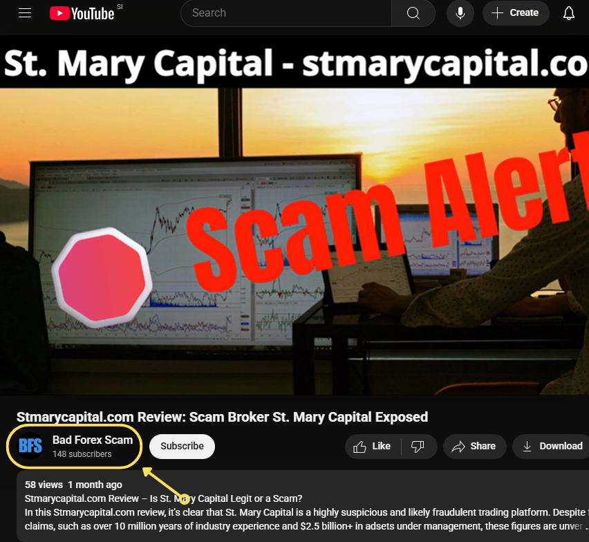 It doesn’t stop with websites. We also came across YouTube channels that accuse platforms like Saint Mary Capital and others of being “scams.” Every video we saw followed the exact same recycled script, narrated with an AI-generated voice.